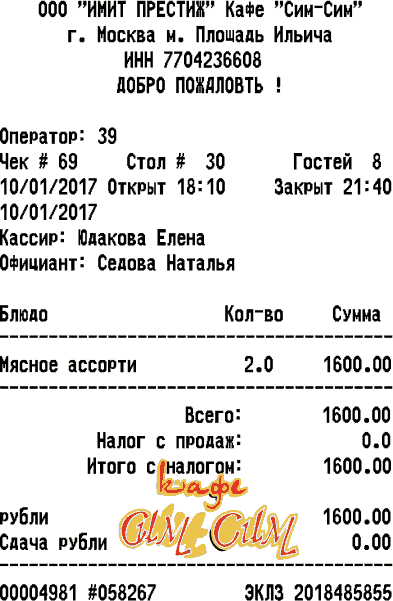 Срок изготовления чека кафе или ресторанного счета с кассовым чеком или без него будет максимально кротчайшим. Мы гарантируем оперативность!